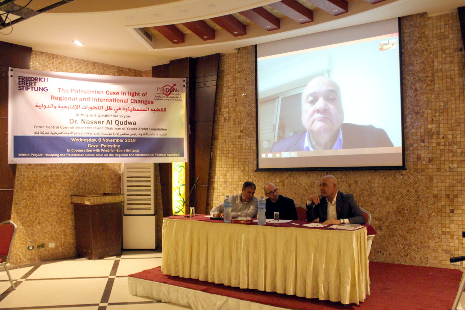 واستضاف اللقاء د. ناصر القدوة اللجنة المركزية لحركة فتح، ورئيس مجلس إدارة مؤسسة ياسر عرفات، عبر السكايب. وتحدث عن الإجراءات الأمريكية-الإسرائيلية ضد الفلسطينيين، وموقف الاتحاد الأوروبي تجاه فلسطين، وعن الأوضاع الإقليمية، والوحدة الوطنية، وعن الانتخابات.